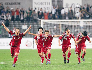 10日是仗香港男足于44分鐘由后衛(wèi)陳偉豪接應角球頂成1﹕0,傾力反撲的朝鮮一度讓香港男足陣腳大亂,結果在完場前5分鐘由樸光龍追成1﹕1,兩軍在加時賽沒有改寫紀錄,須以互射12碼定勝負。
