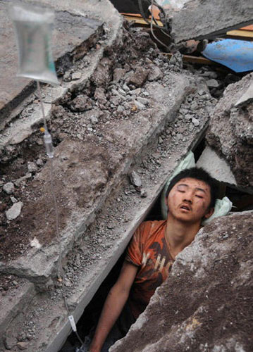 去年5月13日清晨6點多鐘,記者在北川中學的廢墟上,拍攝下了兩張照片:一個穿著黃色T恤、半昏迷的男孩,被夾在垮塌的教學樓預制板夾縫中,僅露出上半身;他的身邊,一個穿著藍色上衣的男孩,正為夾縫中的孩子拎著吊瓶。照片中的兩名男孩,就是后來被人們稱作“吊瓶兄弟”和“夾縫小子”的北川中學高一學生李陽和廖波。