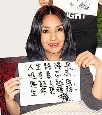 經(jīng)歷一年的恢復(fù),千嬅贊賞政府重建災(zāi)區(qū)的速度很快,像曾受災(zāi)的北川或會(huì)再有余震,現(xiàn)移往新地方重建了另一個(gè)北川,好讓民眾重新開(kāi)展新生活,自給自足。千嬅明白這不是一時(shí)三刻可以完全復(fù)元過(guò)來(lái),重建項(xiàng)目尚要很多年才能真正成功。但令千嬅最欣慰的是:“去年到災(zāi)區(qū)時(shí),城里每個(gè)人臉上都是鎖緊愁眉,這次重臨舊地,就看到連小朋友都變得開(kāi)懷了,臉上有掛上笑容,問(wèn)他們的志愿,大家異口同聲說(shuō)想做醫(yī)生將來(lái)去幫人,所看到的都是充滿生存的意志,這也就是中國(guó)人的特質(zhì),擁有頑強(qiáng)的生命力和團(tuán)結(jié)一致的精神!”