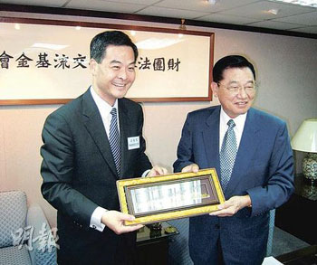 梁振英以香港專業(yè)聯(lián)盟主席身分,率領(lǐng)港交所、貿(mào)發(fā)局、國(guó)際仲裁中心等18名經(jīng)貿(mào)專業(yè)人士組團(tuán)訪臺(tái),23日拜會(huì)“陸委會(huì)”、;鶗(huì)、工業(yè)總會(huì)、商業(yè)總會(huì),由海基會(huì)董事長(zhǎng)江丙坤、“陸委會(huì)”副主委劉德勛接見(jiàn)。