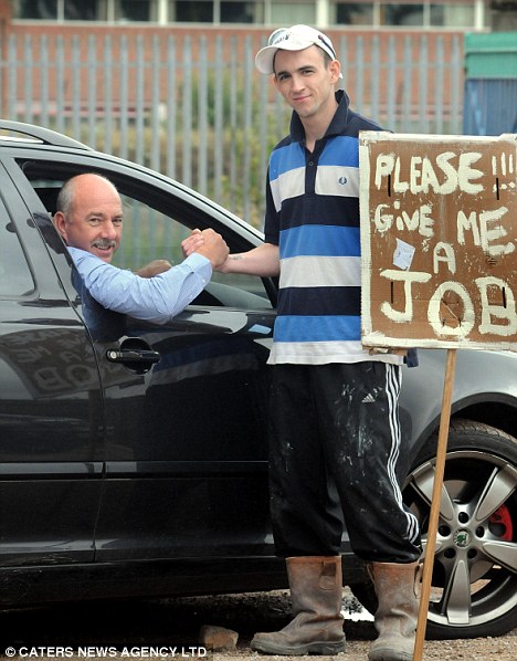 據(jù)稱,威爾頓已經(jīng)兩年沒(méi)有上班了,他不愿再靠領(lǐng)福利金過(guò)日子,于是決定勇敢地“推銷”自己。前一天晚上他為工作問(wèn)題一宿沒(méi)睡,下定決心后,在早上5點(diǎn)起床做牌子。