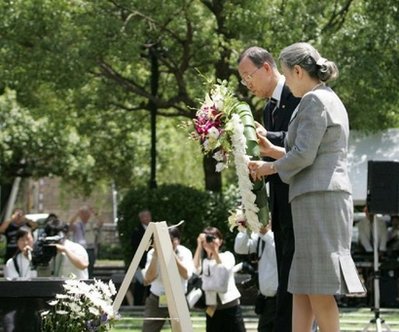 潘基文還前往爆炸中心地公園,向“原子彈落下中心地碑”獻花,然后向全世界宣布自己決心作為聯(lián)合國秘書長全力創(chuàng)建“無核武世界”。此外,潘基文還向附近的“長崎核爆朝鮮死難者追悼碑”獻了花。