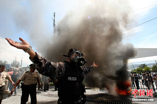 當總統(tǒng)科雷亞30日趕赴基多一處被占領的警察營地試圖平息騷亂時,遭到參與騷亂的警察的催淚瓦斯襲擊,F(xiàn)場視頻顯示,盡管保鏢給科雷亞戴上了防毒面具,但他仍非常不適。腿部也受輕傷的科雷亞隨后被送往附近一家醫(yī)院接受治療。
