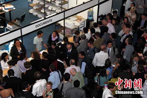 中新社記者現(xiàn)場目擊,在文件發(fā)放處排起了很長的隊(duì)伍,廣大與會(huì)者特別是談判代表都希望先睹為快。文件發(fā)放處前人潮洶涌,多名聯(lián)合國警察被調(diào)往現(xiàn)場維持秩序。
