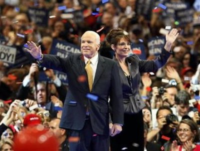當(dāng)?shù)貢r(shí)間4日,麥凱恩和副手佩林在共和黨大會(huì)上向支持者揮手。