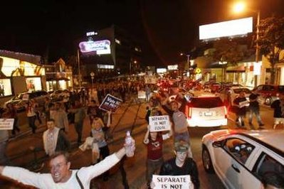 中新網(wǎng)11月6日電 綜合報道,加州數(shù)千名同性戀權(quán)利擁護者當(dāng)?shù)貢r間5日走上街頭,抗議加州通過的禁止同性婚姻提案。