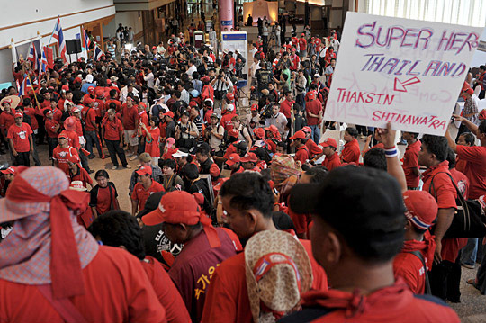 在會(huì)議中心外圍,早上一直堅(jiān)守在門口與四周的一隊(duì)隊(duì)軍警已經(jīng)不見蹤影,原先設(shè)置的鐵架障礙物與鐵絲網(wǎng)也被挪開,舉目所及,酒店的庭院里、樹蔭下、停車場(chǎng)都是人頭攢動(dòng)的“紅衫軍”,他們高舉著要求阿披實(shí)總理辭職的招牌,吶喊不停。