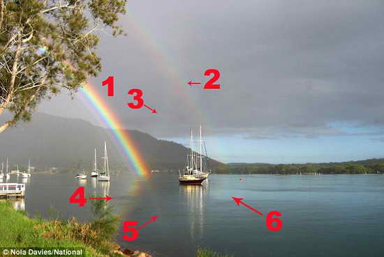 人們幾乎看不清楚第六道彩虹,但是考利博士堅(jiān)持稱,如果你認(rèn)真看,你就能看到第六道彩虹。他說:“諾拉的照相機(jī)只拍到了第六道彩虹(圖示6)的部分,它是河面的一次反射,雨滴內(nèi)的兩次反射形成的。由于進(jìn)行了多次反射,其顏色被擴(kuò)散出去,它的外貌僅依稀可見!(周翔/中國網(wǎng)3月18日訊)