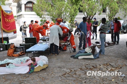 海地當(dāng)?shù)貢r(shí)間14日9時(shí),中國(guó)武警總醫(yī)院赴海地國(guó)際救援醫(yī)療分隊(duì)開設(shè)第一個(gè)流動(dòng)醫(yī)療點(diǎn),已為110名受傷的災(zāi)民提供醫(yī)療救助。海地總理禮賓官趕到醫(yī)療救助點(diǎn),他握著來(lái)自中國(guó)武警總醫(yī)院的醫(yī)生的手說(shuō):“感謝中國(guó)國(guó)際救援隊(duì),你們是第一支來(lái)總理府進(jìn)行人道主義救助的救援隊(duì)”。