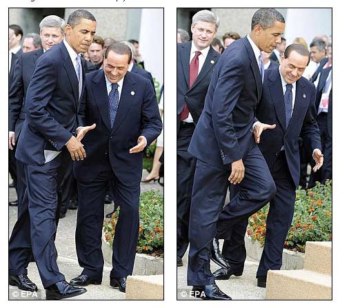 據(jù)英國(guó)《每日郵報(bào)》7月9日?qǐng)?bào)道,作為G8峰會(huì)上的重量級(jí)人物,奧巴馬的到來(lái)讓意大利總理貝盧斯科尼喜出望外。然而這次貝氏可謂是“熱臉貼上了冷屁股”,他滿(mǎn)臉堆笑地伸出手,要和奧巴馬握手,但對(duì)方卻對(duì)他“視而不見(jiàn)”,直接從他前面走過(guò)。