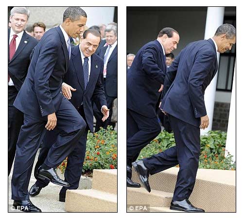 奧巴馬日前到達(dá)八國(guó)峰會(huì)召開(kāi)地——今年4月初遭受地震災(zāi)害的意大利中部城市拉奎拉。當(dāng)時(shí),身為主人的貝盧斯尼克立即伸出手問(wèn)候美國(guó)總統(tǒng)。但是奧巴馬卻轉(zhuǎn)頭閉目,將稍稍抬起的右手放下,直接從貝盧斯科尼旁邊走過(guò),留下貝盧斯科尼一個(gè)人,尷尬地站在那里舉著手。