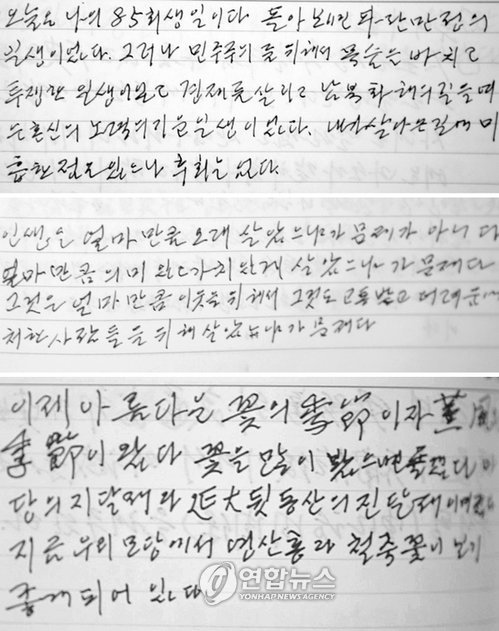但他還進行自我激勵說:“盡管吃了很多苦,但也取得了與眾不同的成功,年齡也已經是85歲,在這世界上還有什么可盼的呢?一定要保持健康,為解決民主主義、國民經濟、南北問題等進行必要的諫言和努力。”(4月27日)