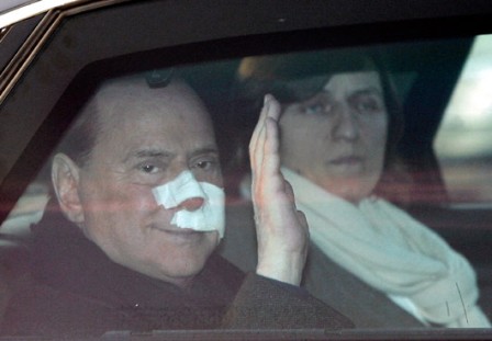 現(xiàn)年73歲的意大利總理貝盧斯科尼13日出席一場政治集會時,遭攻擊者以石制米蘭大教堂模型丟擊中臉部,鼻梁被打斷,牙齒也掉了兩顆。他臉部和嘴唇被割傷、血流滿面的狼狽鏡頭,短短數(shù)秒之內(nèi)就被媒體播送到全球數(shù)百萬觀眾的眼前。
