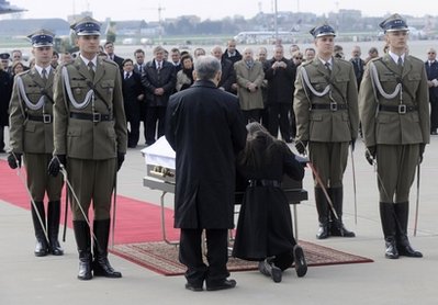 卡欽斯基的靈柩11日由一架波軍直升機(jī)從撞機(jī)地點(diǎn)俄羅斯斯摩棱斯克運(yùn)返波蘭首都華沙,代理總統(tǒng)科莫羅夫斯基、總理圖斯克等官員在場(chǎng)迎接,以一場(chǎng)簡短的宗教儀式向其致祭。靈柩將會(huì)由軍隊(duì)護(hù)送到總統(tǒng)府,稍后,當(dāng)局將會(huì)把總統(tǒng)府開放,讓民眾進(jìn)入瞻仰卡欽斯基的遺容。