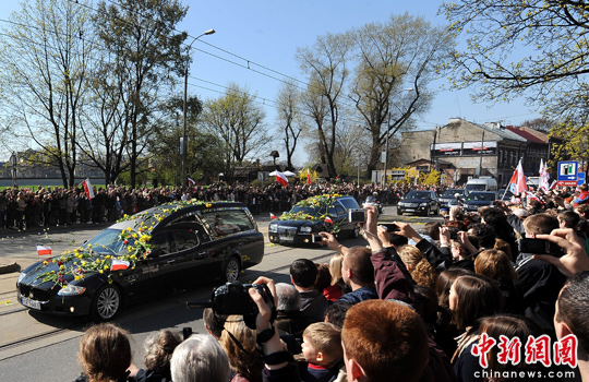 卡欽斯基夫婦的遺體昨日早上從首都華沙,運抵克拉科夫,當靈車緩慢駛過時,道路兩旁的民眾獻上鮮花致敬。于當地時間下午2時,在汽笛和教堂鐘聲之下,圣母大教堂的葬禮正式展開,在教堂外,數以萬計的波蘭人民聚集,透過大銀幕上的直播參與葬禮。其后,卡欽斯基夫婦的棺木被運往瓦維爾宮,接受21響禮炮致敬和安葬,與多位帝王英雄同葬一地。