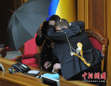 27日,烏克蘭最高拉達(dá)召開會(huì)議,討論是否通過俄黑海艦隊(duì)駐烏克蘭克里米亞半島的租期延期協(xié)議,但會(huì)議現(xiàn)場一度發(fā)生騷亂。議長利特溫被反對派議員用雞蛋打,不得不撐開黑傘躲在后面,F(xiàn)場還發(fā)生了肢體沖突,人們扭打在一起,一片混亂。更有人趁亂在議會(huì)廳內(nèi)放置至少二顆煙霧彈,導(dǎo)致大廳被一片濃煙籠罩,大家紛紛捂住口鼻。
