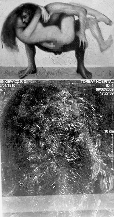 中新網(wǎng)6月23日電 據(jù)香港《文匯報》23日援引外電報道,英國一名藝術(shù)品收藏家于2003年以8500英鎊買入一幅已故畫家羅伯特-林克維科茨與女模特兒赤裸的自畫像(上圖)。該名收藏家聽取專家意見,把畫拿去醫(yī)院進(jìn)行X光掃描,竟發(fā)現(xiàn)畫中有畫,油畫之下蓋另一幅流浪漢肖像畫(下圖),之前從未被拍賣過,估計價值逾5萬英鎊。收藏家相信羅伯特-林克維科茨用畫蓋另一幅畫是另有目的。