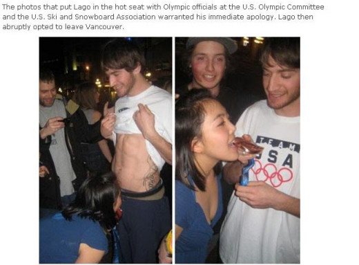 日前,一些關(guān)于拉戈在比賽后慶祝勝利盡情放松的照片在互聯(lián)網(wǎng)上流傳。從照片上看,拉戈與朋友們的慶祝方式極為不雅,他因此被斥為美國隊的恥辱。照片中,拉戈在溫哥華市內(nèi)的一處房屋內(nèi),身著美國隊訓(xùn)練服,佩戴著剛剛獲得的銅牌,而一名不知名的女子在他的腰部左右的位置親吻拉戈的獎牌。