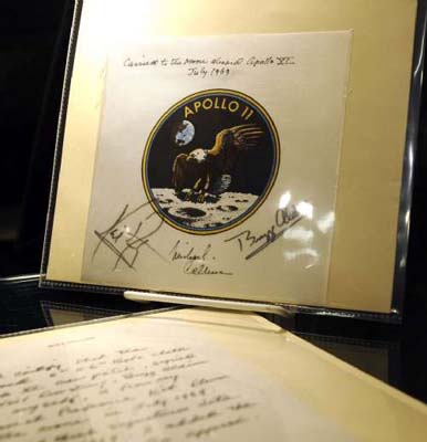 另一個(gè)驚喜是,一枚原來估價(jià)最高達(dá)三萬(wàn)五千美元的“阿波羅十一號(hào)”徽章,竟以六萬(wàn)一千美元售出。這枚徽章直徑長(zhǎng)八點(diǎn)九厘米,上面印有一只在月球表面上空飛行的鷹。