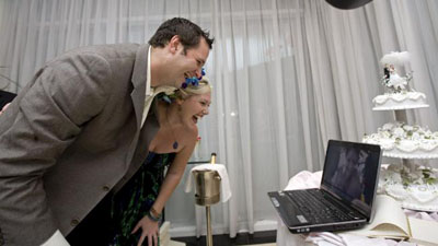 眼看婚禮要泡湯,兩人靈機(jī)一動(dòng),決定通過(guò)網(wǎng)絡(luò)向倫敦的親友們直播婚禮儀式。機(jī)場(chǎng)酒店人員獲悉后不但借給他們安裝了Skype聊天工具的電腦,而且還將酒店進(jìn)行了一番裝飾布置,并定做了一個(gè)三層結(jié)婚蛋糕。