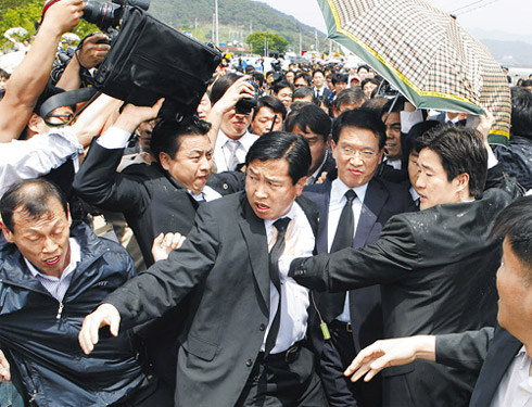 23日,和隨行人員一起乘坐大巴來到峰下村的韓國(guó)國(guó)務(wù)總理韓升洙在村子的入口處被“熱愛盧武鉉的人們的集會(huì)(盧愛會(huì))”會(huì)員和村民攔住。