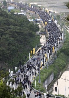 從24日上午至27日下午4時,在四天時間里共有38萬多名吊客在這里就餐。主要由附近村莊的婦女會員和義勇消防隊隊員組成的300多人的志愿團從上午11時到晚10時準備出供10萬多人食用的飯(以27日為準),分發(fā)給市民。晚10時以后提供面包和牛奶、碗面。據(jù)悉,在29日舉行盧武鉉遺體告別儀式后,葬禮委員會和金海市政府等將分擔食品費用。