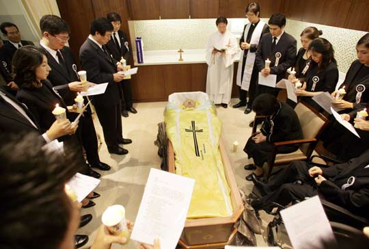 下午1時(shí)30分開始在首爾西橋洞教堂主任神父尹日善(音)的主持下舉行了入殮彌撒。
