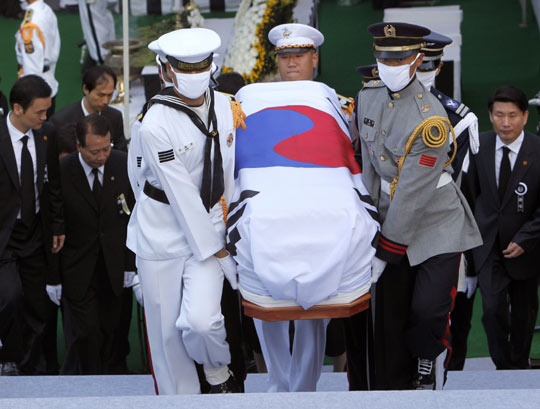 金大中遺屬李姬鎬女士等、韓國總統(tǒng)李明博和第一夫人金潤玉、前總統(tǒng)金泳三、憲法機關(guān)負責(zé)人、駐韓外交使節(jié)、各國代表及市民等歷史最大規(guī)模的3萬多人參加了當(dāng)天在國會前院舉行的遺體告別儀式。儀式持續(xù)約90分鐘。