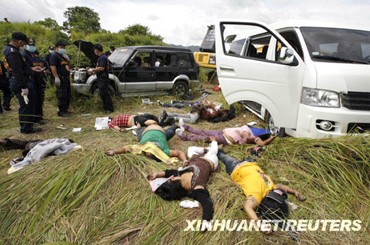 菲律賓南部棉蘭老島自治區(qū)內(nèi)的馬京達(dá)瑙省23日發(fā)生兇殘屠殺事件。一伙為數(shù)約100人的不明身份持槍者劫持了數(shù)十名當(dāng)?shù)卣缛耸亢陀浾摺?/p>