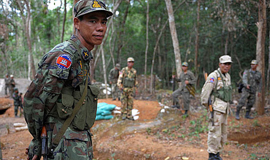 世界法庭在1962年裁定古寺歸柬埔寨所有,但由于柬埔寨數(shù)十年來(lái)的戰(zhàn)爭(zhēng)導(dǎo)致兩國(guó)邊界地區(qū)布滿地雷,因此,柬泰邊界一直沒有劃定界限。