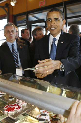 該店員工杰西卡•米連是一位奧巴馬超級粉絲,幸運(yùn)地被選中為美國總統(tǒng)服務(wù)。她選擇了肉桂糖粉口味,并用楓糖漿和巧克力醬寫上了字母“O”,以代表奧巴馬!斑@絕對是我生命中最激動人心的時刻!泵走B在接受采訪時說,“我們還聊天了。他是個非常和藹可親的人,我甚至不覺得自己在和美國總統(tǒng)說話!