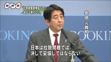 據(jù)日本NHK電視臺18日報道,日本前首相安倍晉三在美國華盛頓演講時明確指出,關于人質綁架問題日本絕對不會就此妥協(xié)。只要享有人權的被綁架者歸國無法實現(xiàn),日本不會同朝鮮恢復邦交正;,而朝鮮跨越日本領土發(fā)射導彈的挑釁行為絕對無法容忍。