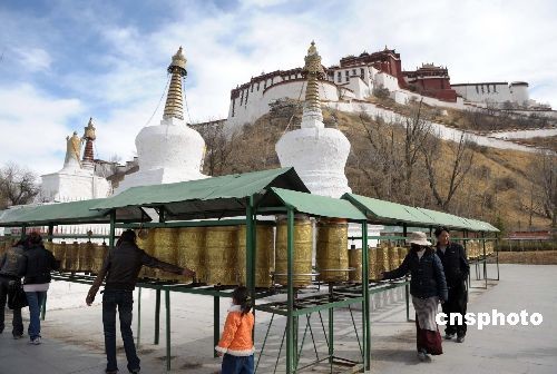 3月20日,拉薩民眾在布達(dá)拉宮下的宗角祿康公園內(nèi)轉(zhuǎn)經(jīng)。
