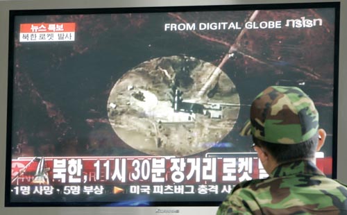 當天,首爾站、長途客運站和地鐵站等處的電視機前聚集了很多市民,電視上正播出朝鮮發(fā)射火箭的消息,每位市民都顯得憂心忡忡。