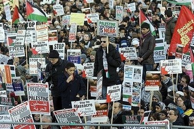 在倫敦,數(shù)千人手持巴勒斯坦旗幟,在首相府外抗議,部份示威者又向首相府扔鞋。