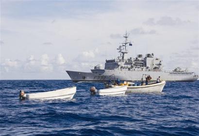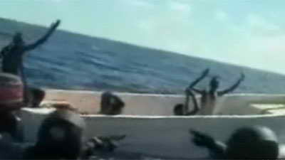 據(jù)英國媒體報道,5月4日,法國海軍將抓獲11名索馬里海盜的錄像公布于眾。法國海軍在塞舌爾島以外海域俘虜11名索馬里海盜。當(dāng)時,這些海盜蔣法國軍艦誤認(rèn)為是商船。據(jù)報道,事實上,海盜們想襲擊的是參與歐盟打擊海盜行動、在當(dāng)?shù)睾S蜓策壍姆▏鴮?dǎo)彈護衛(wèi)艦“雪月號”。
