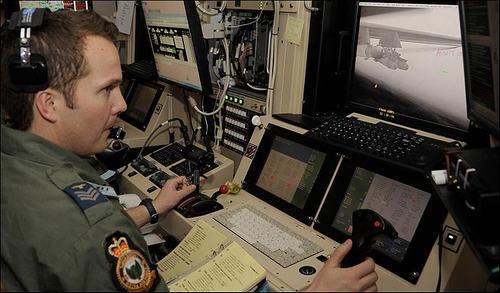 坐在扶手椅上的飛行員駐扎在美國內(nèi)華達(dá)沙漠基地中心的一間地面控制站內(nèi)。與電子游戲玩家一樣,他們使用一個手柄來操縱價值6百萬英鎊的無人機(jī),手柄上有一個開火鍵!笆崭钫摺睙o人機(jī)上的偵察攝像機(jī)能確定敵方狙擊手、恐怖分子隱藏地點的位置,干掉恐怖分子的機(jī)槍陣地、武器庫、路邊炸彈。“收割者”無人機(jī)飛行員、32歲的基爾南中校來自諾丁漢。他說:“在這里,你每天都在前線,雖然距阿富汗有12874公里的距離,你每天都在這里執(zhí)行飛行任務(wù)以支援駐阿富汗的部隊!