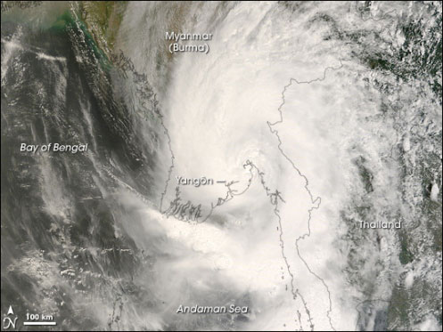 美國“今日宇宙”(universetoday)網(wǎng)站公布的衛(wèi)星照片顯示,強(qiáng)熱帶風(fēng)暴“納爾吉斯”2日開始在緬甸伊洛瓦底省;鶏u附近登陸,風(fēng)暴登陸時的最大風(fēng)力超過190公里。風(fēng)暴登陸后轉(zhuǎn)向緬甸三角洲地區(qū),一路掃蕩伊洛瓦底省、勃固省和仰光省,3日凌晨突然抵達(dá)仰光市中心。屬于第三級熱帶氣旋的“納爾吉斯”一路沿仰光西南約220公里的伊江江口登陸北上,沿途摧毀無數(shù)的建筑物。