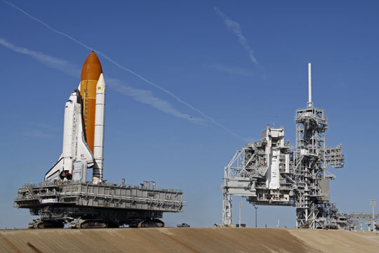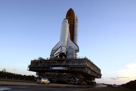 據(jù)《星島日報》報道,發(fā)現(xiàn)號放在輸出平臺,經(jīng)過6小時的行程,抵達發(fā)射臺。發(fā)現(xiàn)號將于下月12日升空,為穿梭機展開2009年首次旅程。