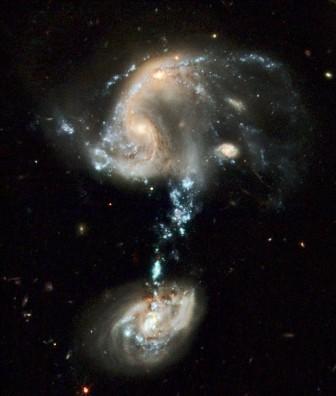 被稱作Arp 194的星系群,圖片中出現(xiàn)的明亮的藍(lán)色彩帶,其實(shí)是新生藍(lán)色恒星向外延伸的完整的螺旋臂。當(dāng)兩個(gè)星系利用引力相互作用時(shí),就會(huì)出現(xiàn)這種現(xiàn)象。