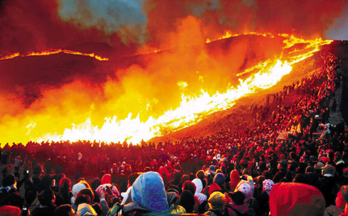 中新網(wǎng)2月10日電 據(jù)韓國(guó)《朝鮮日?qǐng)?bào)》報(bào)道,農(nóng)歷正月十五(9日)晚,韓國(guó)許多游客前來慶尚南道昌寧郡火旺山山頂觀看“火燒紫芒活動(dòng)”。這時(shí)候突然一陣強(qiáng)風(fēng)襲來,引起大火,在四處躲避蔓延開來的火苗的過程中,4名游客不幸遇難,52人受傷。傷者中有4人全身燒傷,處于病危狀態(tài)。但由于是晚上發(fā)生在山頂?shù)氖鹿,未能進(jìn)行確切的受害統(tǒng)計(jì),因此,過了一夜以后,死傷人數(shù)可能會(huì)大幅增加。