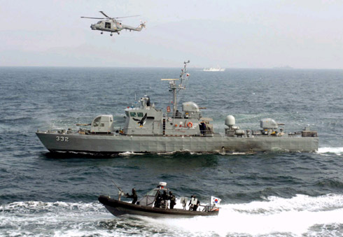 當(dāng)天,韓國(guó)型驅(qū)逐艦“文武大王艦”、一架反潛直升機(jī)和兩艘高速短艇和負(fù)責(zé)船舶搜查任務(wù)的海軍特種士兵參與了演習(xí)。