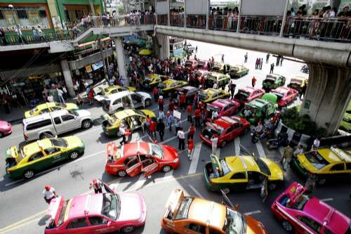 中新網(wǎng)4月10日電 據(jù)泰國《民族報》10日報道,曼谷勝利紀(jì)念碑附近及周圍的數(shù)條街道被數(shù)百反政府的出租車司機(jī)、摩托車司機(jī)和約5000示威者擁堵,曼谷市中心的交通已經(jīng)癱瘓。