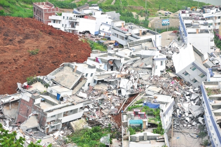 然而集鎮(zhèn)背后,高聳的大山被生生拉了一條“傷痕”——灰色的土石從山腰傾瀉而下,一直拉到集鎮(zhèn)的邊緣。土石經(jīng)過(guò)的地方,所有的民房都被埋了進(jìn)去。集鎮(zhèn)上靠近山坡的房屋,也有許多未能幸免。或被埋、或倒塌、或傾斜,剛剛建起的新房成了廢墟。經(jīng)歷過(guò)“5·12”特大地震的當(dāng)?shù)厝苏f(shuō),這些房屋的樣子和地震沒(méi)什么兩樣。