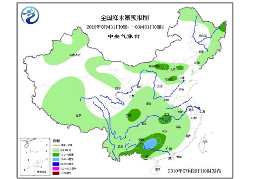 31日08時至8月1日08時,西北地區(qū)東南部、華北、東北、江漢、江南中西部、華南西北部、西南地區(qū)大部有小到中雨或陣雨。
