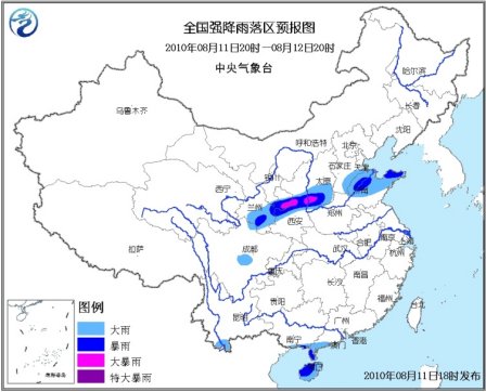 中新網(wǎng)8月11日電 據(jù)中央氣象臺消息,中央氣象臺8月11日18時繼續(xù)發(fā)布暴雨藍(lán)色預(yù)警:8月11日20時到8月12日20時,甘肅南部和東部、陜西中部、山西中南部、河北南部、山東中北部、四川盆地西部、廣西南部、廣東西南部、海南、云南南部等地的部分地區(qū)有大雨或暴雨,其中,甘肅東部、陜西中部、山西西南部等地的局部地區(qū)有大暴雨;上述地區(qū)局地并伴有短時雷雨大風(fēng)等強(qiáng)對流天氣。
