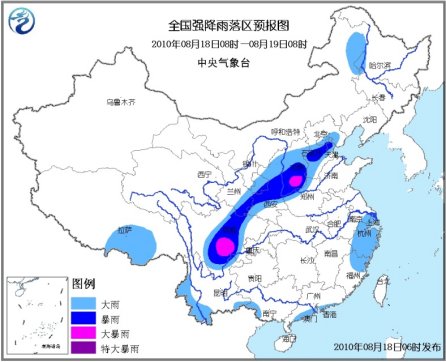 8月18日08時到8月19日08時,四川盆地中西部、川西高原東部、甘肅東部和南部、陜西中北部和西南部、山西大部、河南北部、河北中南部和東北部、北京東部和南部、天津、內(nèi)蒙古東北部、黑龍江西南部、江蘇東南部、上海、浙江大部、福建北部、廣東南部沿海、廣西西南部、云南西部和南部、西藏中部偏南地區(qū)等地的部分地區(qū)有大雨或暴雨,其中四川盆地西南部、山西南部等地的局地有大暴雨;上述局部地區(qū)并伴有短時雷雨大風(fēng)等強(qiáng)對流天氣。