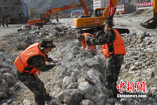 自8月8日以來,武警水電部隊500余名官兵和130余臺大型機械設備日夜連續(xù)奮戰(zhàn)在舟曲白龍江堰塞體搶險一線,他們采取“挖、裝、運”相結合、調運長臂反鏟深掏、人工安裝鐵絲籠固定護坡等作業(yè)方式,疏通河道,加快白龍江存水泄流速度,盡快消除洪水隱患。