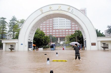 7時(shí)20分,在暨南大學(xué)正門(mén),看到水已經(jīng)浸到了黃埔大道路邊直至,水勢(shì)最深處約有40厘米,學(xué)生撐著傘在水中緩緩前行。暨大的門(mén)衛(wèi)表示,今次雖然水浸,但是地下車(chē)庫(kù)并沒(méi)有受淹。