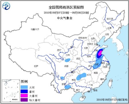 中新網(wǎng)9月7日電 據(jù)中央氣象臺網(wǎng)站消息,中央氣象臺9月7日18時繼續(xù)發(fā)布暴雨藍色預(yù)警:9月7日20時到8日20時,山東中南部、安徽大部、江蘇北部和西部、湖北東部、湖南中部偏西地區(qū)、貴州東部、甘肅東南部、川西高原北部、云南東南部等地有大雨或暴雨,其中,山東東南部和江蘇北部的局部地區(qū)有大暴雨;上述部分地區(qū)并伴有短時雷雨大風等強對流天氣。